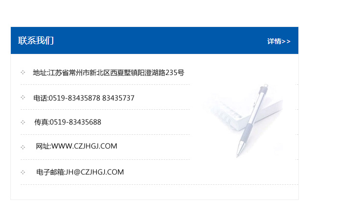 傳真:0519-83435688    郵編:213135    網址:WWW.czjhgj_com.qilingdn.com    電子郵箱:JH@czjhgj_com.qilingdn.com